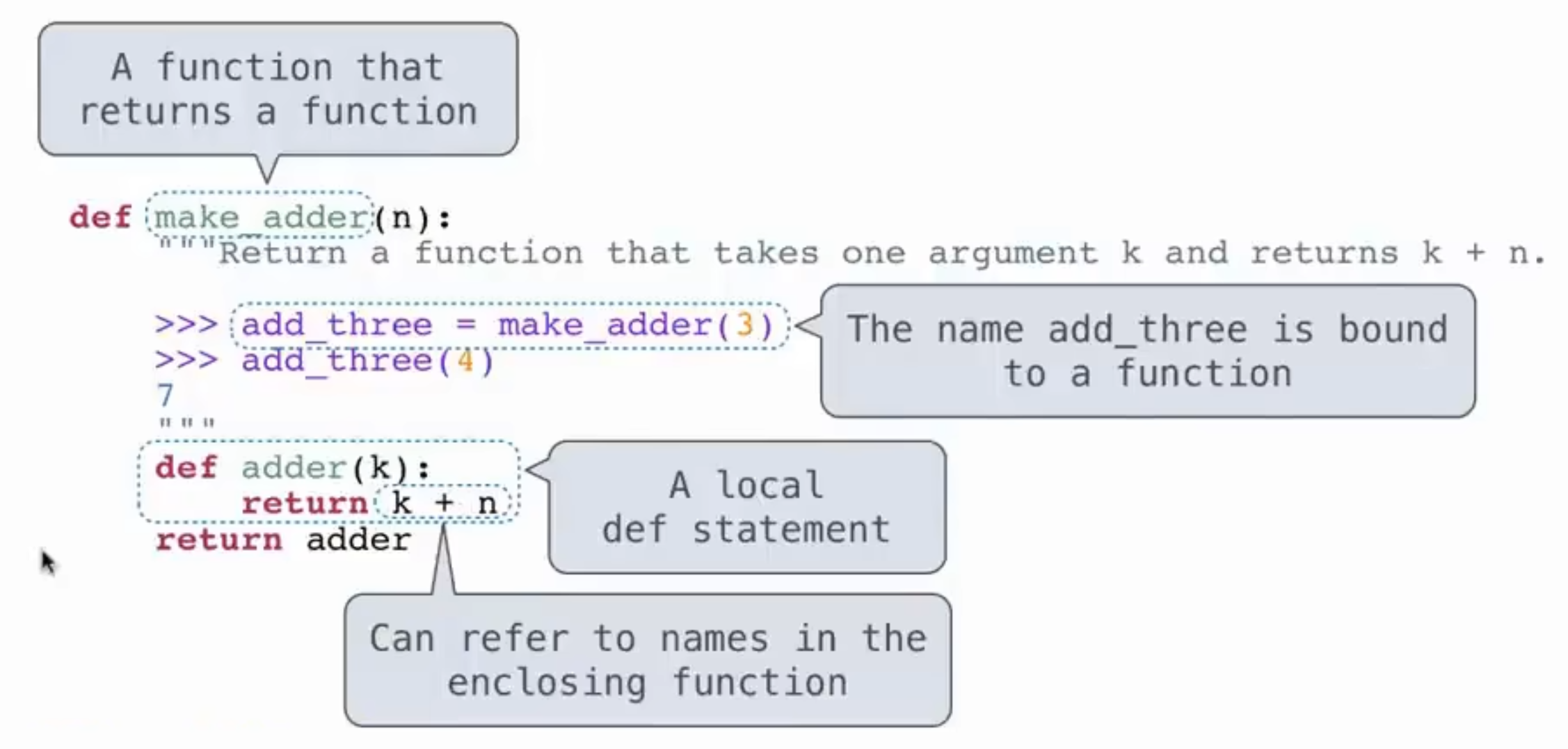 - 在像 Python 这样的带有词法作用域的语言里,当一个函数在另一个函数内部被定义并返回时,它会“带着”定义时的外部变量环境一起返回。即使外层函数已经结束执行,内部函数仍然能访问那些外层变量。